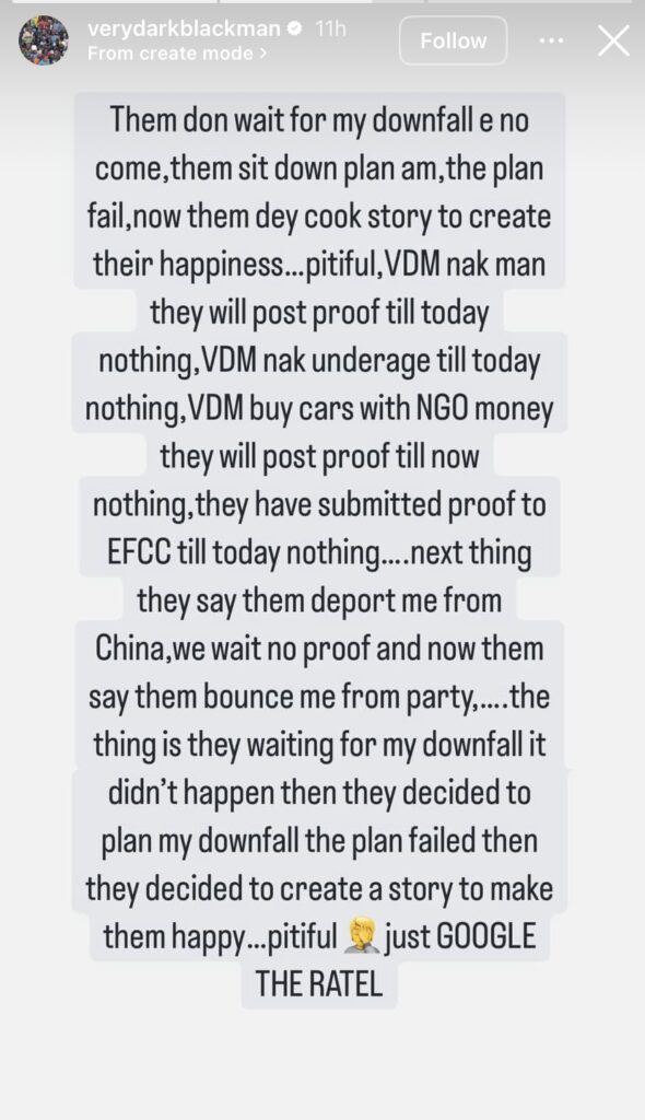 Media personality Radiogad had shared a post online claiming that VDM, who resides in Abuja, was not invited to the high-profile event in the capital and even attempted to gatecrash the party.