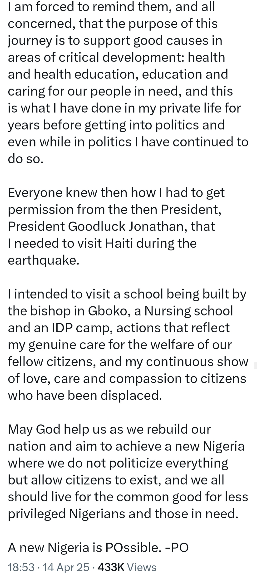 "On Thursday, the 10th of April, I had planned to visit Plateau and Benue State, respectively. Plateau on Sunday, the 13th of April 2025, and Benue on Monday, the 14th of April 2025. My trip included paying courtesy calls to the governors as well as visiting the IDP camps and schools of nursing in both states to give my support.