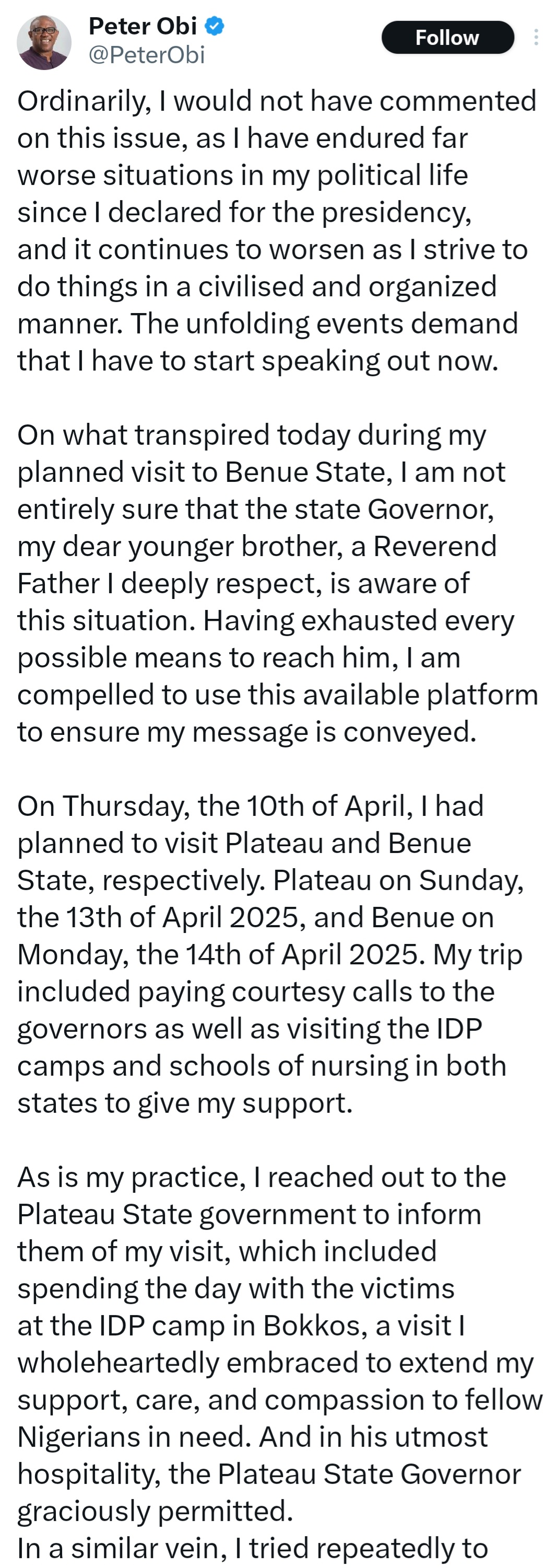 In a statement shared on Monday via X, Obi expressed disappointment over the reaction from the Benue State Government to his scheduled courtesy call and planned visits to internally displaced persons (IDPs) camps and health institutions in the state.