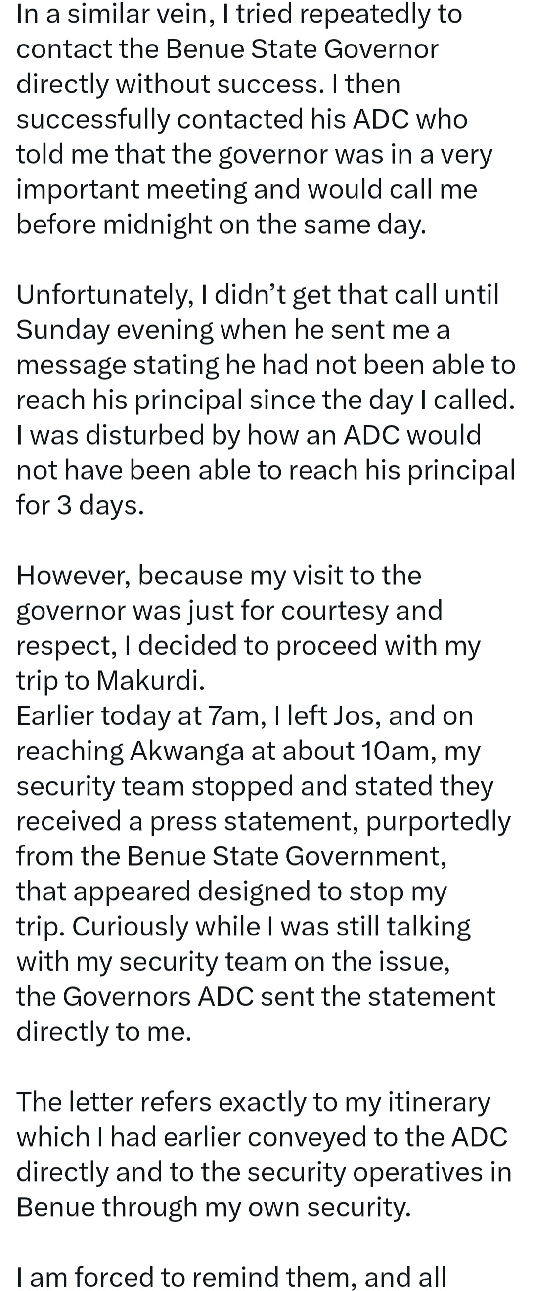 "Earlier today at 7am, I left Jos, and on reaching Akwanga at about 10am, my security team stopped and stated they received a press statement, purportedly from the Benue State Government, that appeared designed to stop my trip. Curiously while I was still talking with my security team on the issue, the Governors ADC sent the statement directly to me.