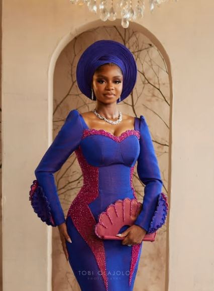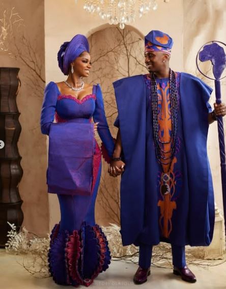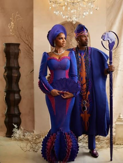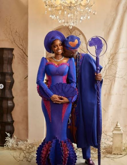 Nigerian influencer, Priscilla Ojo and Tanzanian singer Juma Jux, looked like royalty in purple as they stepped out in their first outfit for their traditional wedding.