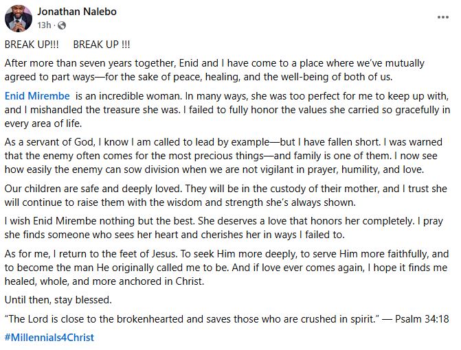 Jonathan Nalebo, a popular Ugandan preacher has gone viral on social media after revealing that he separated from his wife, Enid Mirembe, because she was “too perfect” for him to handle.