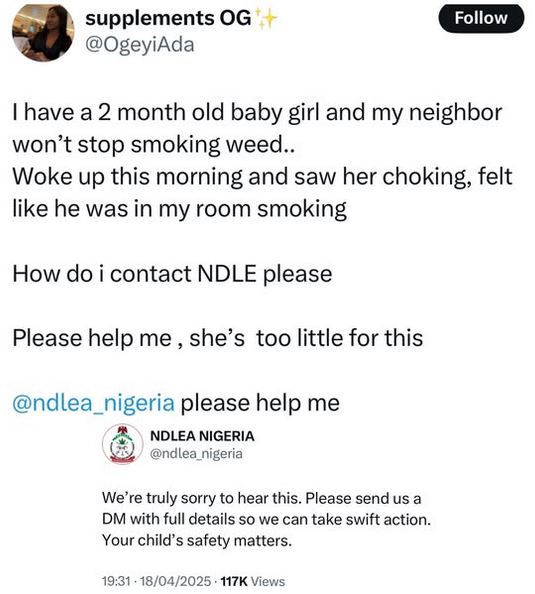 She mentioned that she has tried to ask him to stop smoking as it affects her newborn baby, but that all her pleas have fallen on deaf ears. She asked for help in locating NDLEA officials so they can wade into the matter.