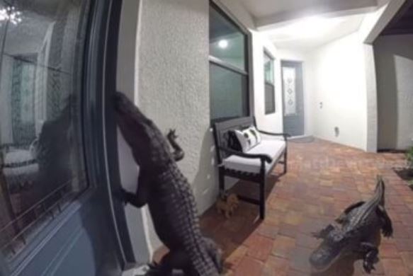 A normal doorstep transformed into a bizarre wildlife encounter recently when two enormous alligators appeared and rang the doorbell of a Florida residence.