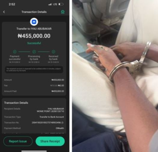 The influencer shared a bank transfer receipt showing the recipient details as IYAU ABUBAKAR MONIE POINT | 8200126710 and pictures of himself in handcuffs.