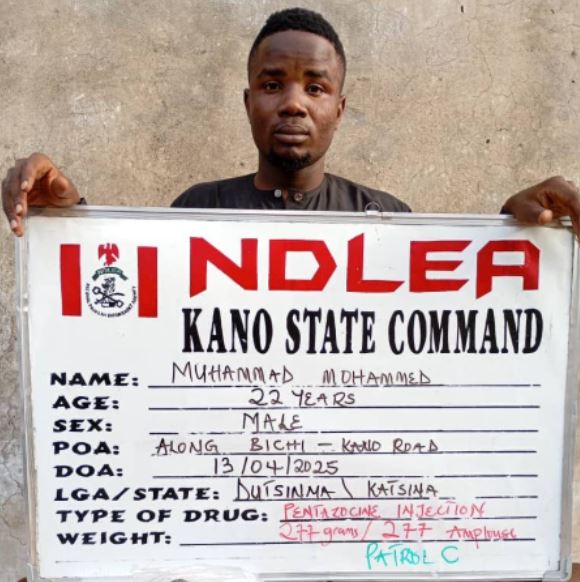 “In Kano, a 22-year-old supplier of illicit substances to bandits, Muhammad Mohammed, has been arrested by NDLEA operatives on patrol along Bichi — Kano road while heading to Katsina with 277 ampoules of pentazocine injection tied to his thigh and private part with Cello tape.