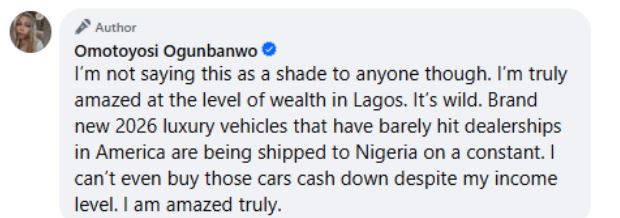 “I’m not saying this as a shade to anyone though. I’m truly amazed at the level of wealth in Lagos. It’s wild. Brand new 2026 luxury vehicles that have barely hit dealerships in America are being shipped to Nigeria on a constant. I can’t even buy those cars cash down despite my income level. I am amazed truly.”