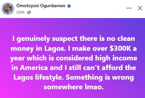 “I genuinely suspect there is no clean money in Lagos. I make over $300K a year which is considered high income in America and I still can’t afford the Lagos lifestyle. Something is wrong somewhere lmao,” she wrote.