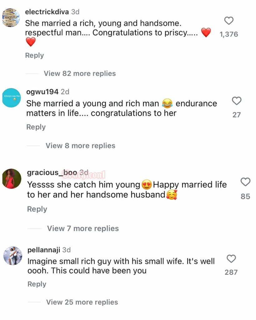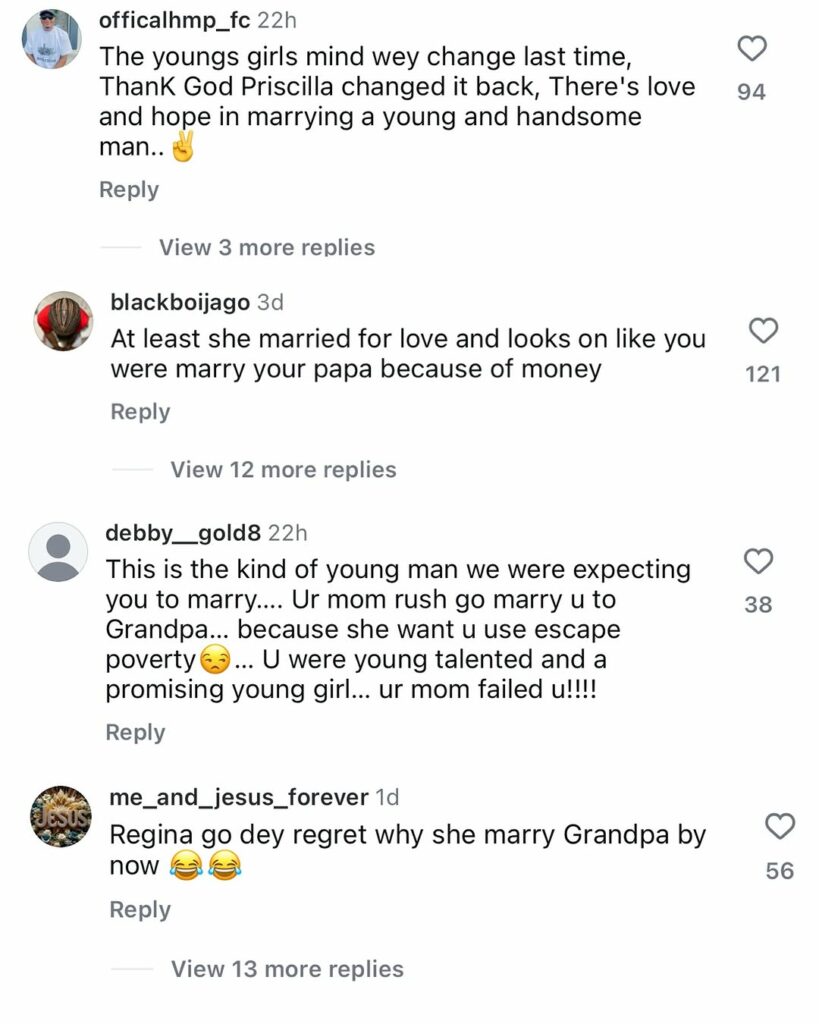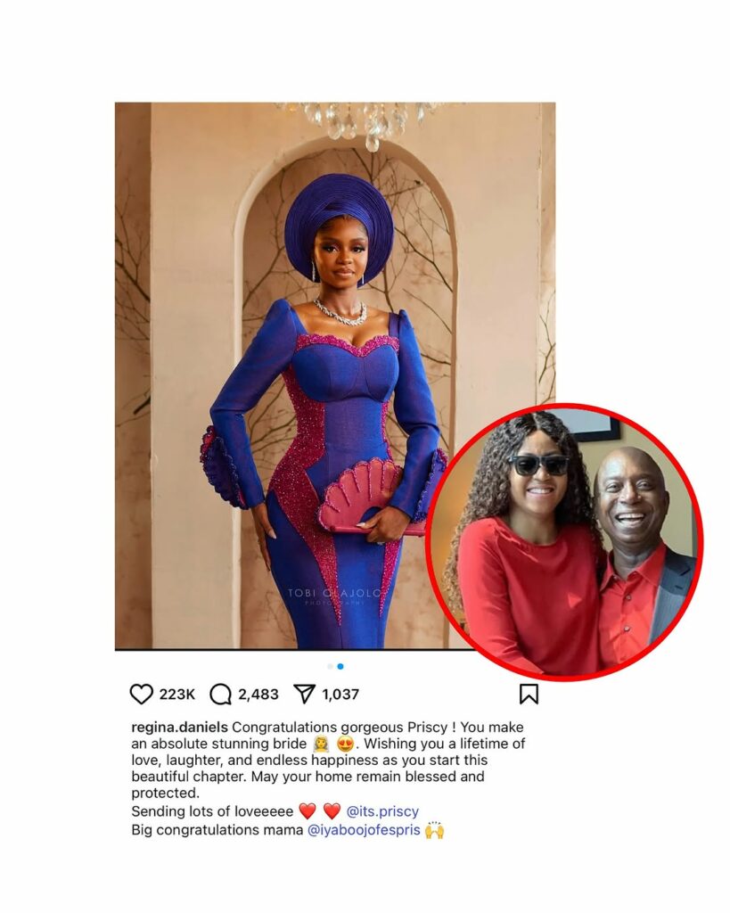 To celebrate with Priscilla, actress, Regina Daniels took to her Instagram page to wish the newly wed couple well.