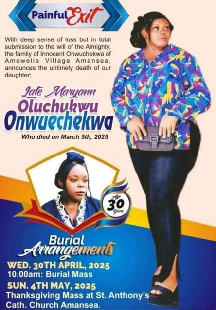 She will be laid to rest on April 30, 2025, in her hometown, Amansea, in Awka North Local Government Area of Anambra State.