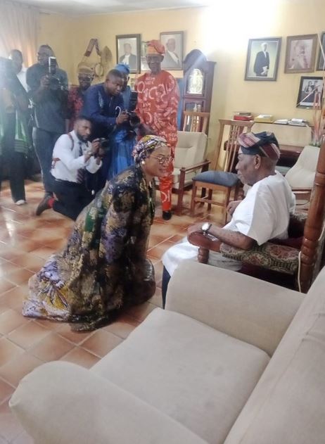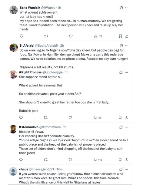 Social media users are reacting to a post made by Sunday Dare, the Special Adviser on Media and Public Communication to President Tinubu, applauding the First Lady, Sen Remi Tinubu, for kneeling before Afenifere leader, Pa Reuben Fasoranti, in Akure, the Ondo state capital.