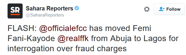 In a Tweet posted by SaharaReporters on their official page, the embattled PDP chieftain "has been moved from Abuja to Lagos for interrogation over fraud charges."