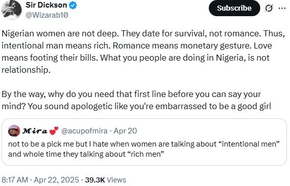‘’Nigerian women are not deep. They date for survival, not romance. Thus, intentional man means rich. Romance means monetary gesture. Love means footing their bills. What you people are doing in Nigeria, is not relationship.
