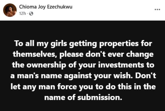 A Nigerian woman, Chioma Joy Ezechukwu, has advised women not to change ownership of properties they acquired to their man's name against their wish.