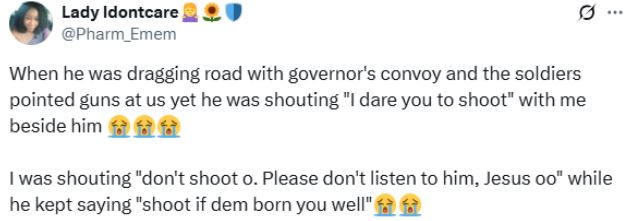 "When he was dragging road with governor's convoy and the soldiers pointed guns at us yet he was shouting "I dare you to shoot" with me beside him. I was shouting "don't shoot o. Please don't listen to him, Jesus oo" while he kept saying “shoot if dem born you well,” she wrote.