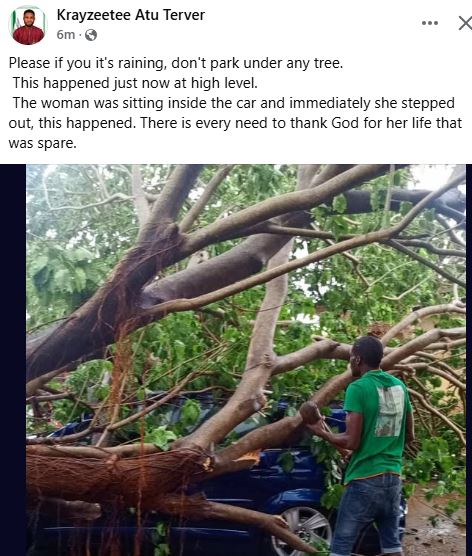 “Please if it's raining, don't park under any tree. This happened just now at high level. The woman was sitting inside the car and immediately she stepped out, this happened. There is every need to thank God for her life that was spared,” he wrote.