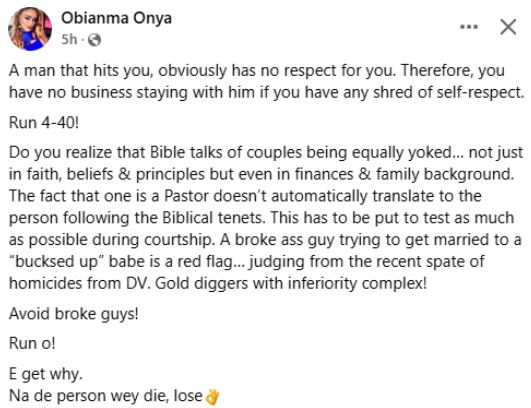 She stated this in a Facebook post while reacting to the recent spate of domestic violence in the country, particularly the d3ath of Shimite Bello.