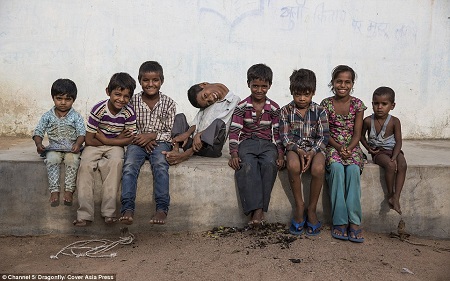 Here he is pictured with his friends at home in Madhya Pradesh, India, prior to the surgery which should help his head become upright