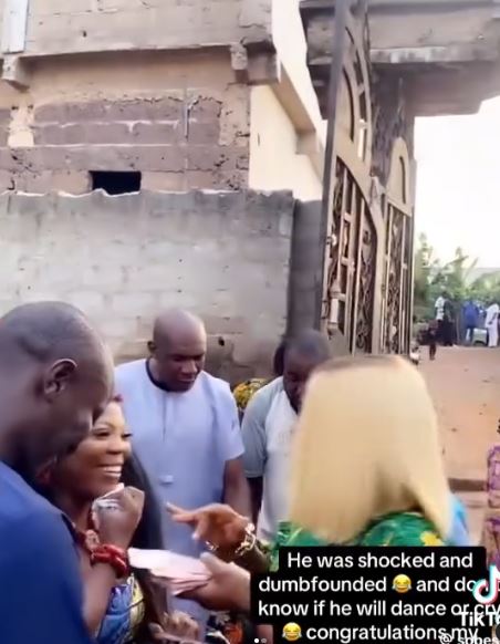The woman, dressed in traditional attire, approached the couple on the dance floor and began spraying naira notes on them in a display typically associated with celebration and goodwill at Nigerian weddings.