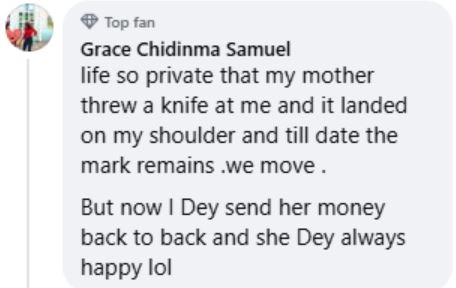 “Life so private that my mother threw a knife at me and it landed on my shoulder and till date the mark remains. We move. But now I Dey send her money back to back and she Dey always happy lol,” she wrote.