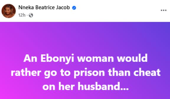 “An Ebonyi woman would rather go to prison than cheat on her husband,” she wrote in a Facebook post on Wednesday, April 23.