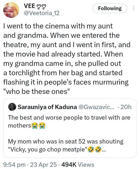 She wrote on X: "Went to the cinema with my aunt and grandma. The movie had already started, so my aunt and I slipped into our seats quietly.