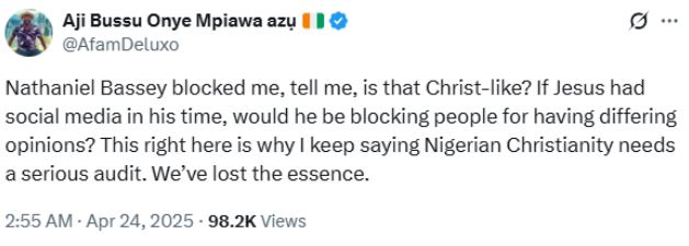 ‘’Nathaniel Bassey blocked me, tell me, is that Christ-like? If Jesus had social media in his time, would he be blocking people for having differing opinions?