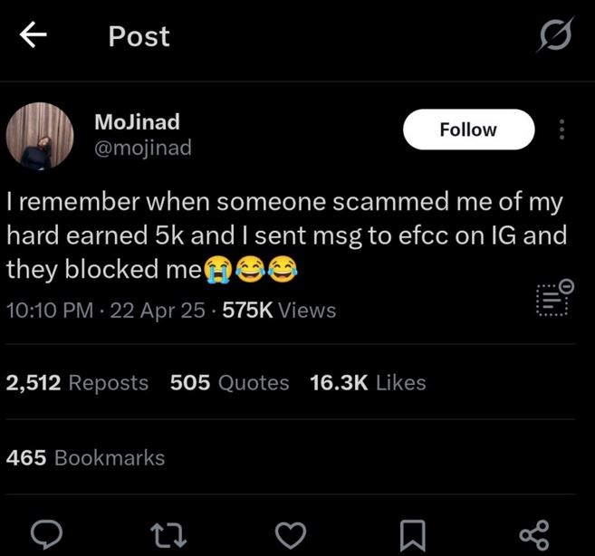 She wrote: “I remember when someone scammed me of my hard-earned 5k and I sent a message to EFCC on IG, and they blocked me.”