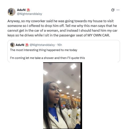 “Anyway, so my coworker said he was going towards my house to visit someone so I offered to drop him off. Tell me why this man says that he cannot get in the car of a woman, and instead I should hand him my car keys so he drives while I sit in the passenger seat of MY OWN CAR,” she wrote.