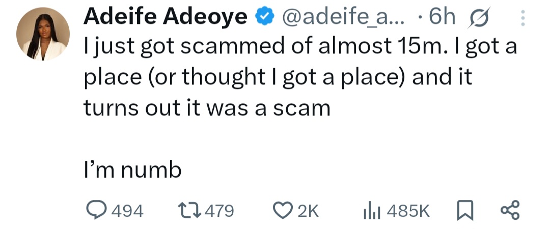 She took to X to write: "l just got scammed of almost 15m. l got a place (or thought l got a place) and it turns out it was a scam."