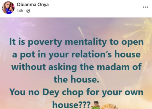 “It is poverty mentality to open a pot in your relation’s house without asking the madam of the house. You no Dey chop for your own house??,” she wrote in a Facebook post on Saturday.