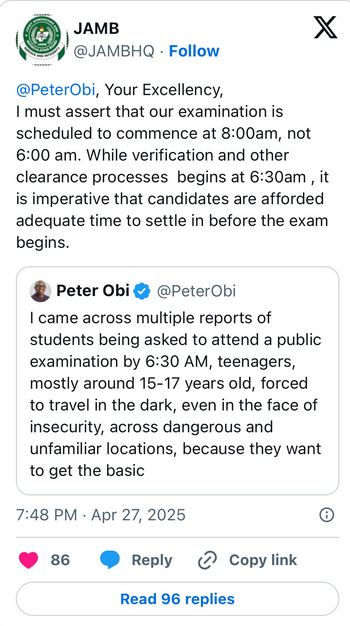 In a brief counter-statement, JAMB debunked Obi’s claim, stating that no exams were scheduled to start at 6 am. The body clarified that the 2025 UTME exams were scheduled to commence at 8 am, with verification and clearance processes beginning at 6:30 am.