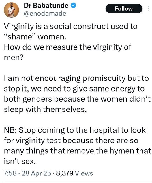 A medical doctor, Dr Babatunde, has warned people to stop coming to the hospital to carry out virginity tests on women.