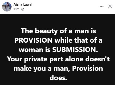 “The beauty of a man is PROVISION while that of a woman is SUBMISSION. Your private part alone doesn't make you a man, Provision does,” she wrote.
