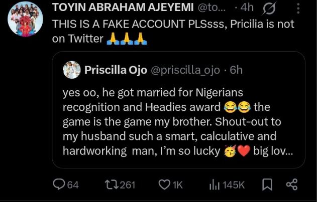 The fake account had responded to a user who accused Priscilla’s husband, Juma Jux, of marrying her just to gain recognition among Nigerians.
