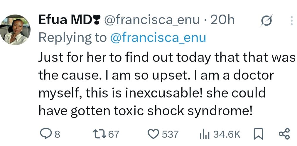 A medical doctor has taken to the X platform to fume after the medical practitioner who helped her friend give birth left a pad inside her.