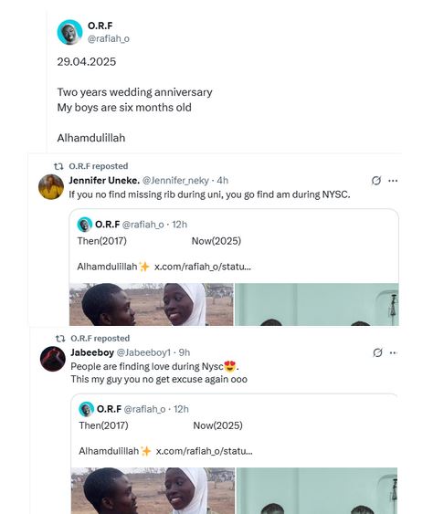 Taking to X on Tuesday, April 29, she shared a throwback photo with her husband during NYSC and a new one with their adorable twin boys.