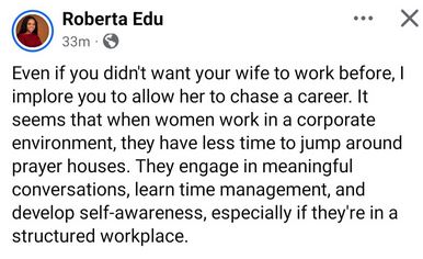 "It seems that when women work in a corporate environment, they have less time to jump around prayer houses. They engage in meaningful conversations, learn time management, and develop self-awareness, especially if they're in a structured workplace.