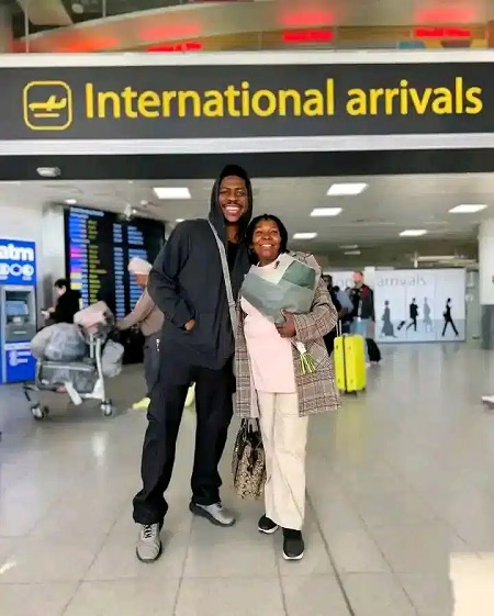 The duo met at the airport as Moses Bliss and his mother are seen exiting an elevator to board a flight to the United Kingdom.