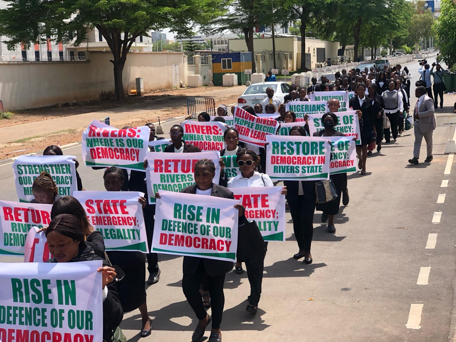 A coalition of human rights lawyers, operating under the banner of Lawyers in Defence of Democracy, staged a protest in Abuja on Wednesday, calling for the restoration of democratic governance in Rivers State.