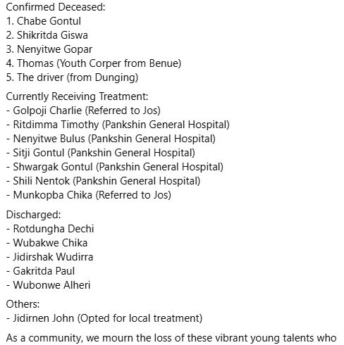 A serving corps member, Ukeyima Thomas, was among the four players of the Lebwit Football Academy, who tragically d!ed in a road accident around Kwanam Maciji-Pankshin-Kanke road in Plateau State.