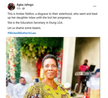 “This is Amber Ndifon, a disgrace to their sisterhood, who went and beat up her daughter-in-law until she lost her pregnancy. She is the Education Secretary in Etung LGA. Let us shame some beasts,” he wrote.