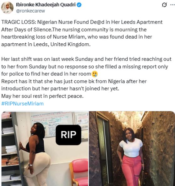 Another Nigerian nurse, Ibironke Khadeejah Quadri, who shared the sad story on X, said the deceased, known as Nurse Miriam, finished her last shift on Sunday and wasn't heard from since.
