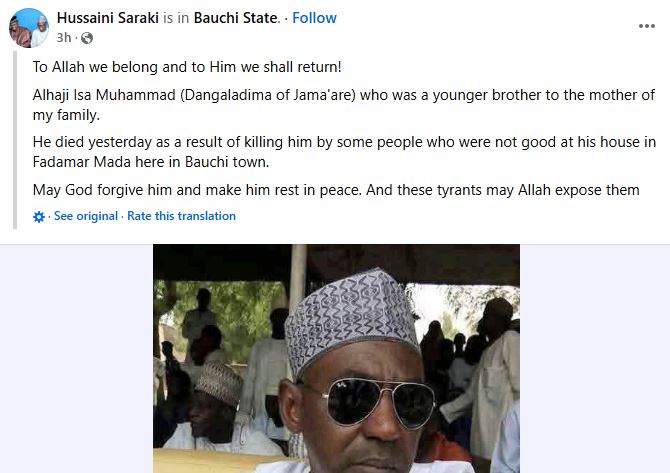 A suspect has been arrested by the Bauchi State Police Command in connection with the heinous m8rder of a former chairman of Jama'are Local Government Area of the state, Alhaji Isa Muhammad Wabi (Dangaladiman Jama'are).