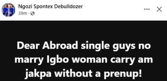 The woman took to her Facebook page to advise abroad-based men not to marry Igbo women and relocate them abroad without signing a prenup.