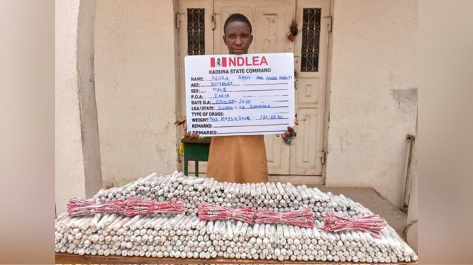 The statement partly reads, "In Kaduna, NDLEA operatives on patrol along Kaduna - Zaria expressway on Saturday 3rd May intercepted a commercial vehicle coming from Nasarawa State heading to Zamfara State. A search of the vehicle led to the discovery of a total of Nine Hundred and Forty-Two (942) explosives concealed in a sack and the subsequent arrest of a 30-year-old suspect Nura Sani Muhammad (alias Nura Hariji).”