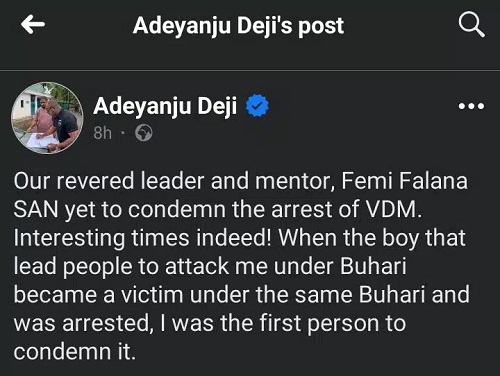 Writing on Facebook, Adeyanju wrote: “Our revered leader and mentor, Femi Falana SAN yet to condemn the arrest of VDM. Interesting times indeed! When the boy that lead people to attack me under Buhari became a victim under the same Buhari and was arrested, I was the first person to condemn it”.