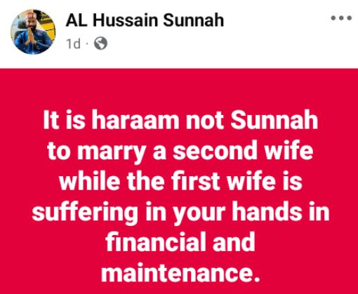 “It is haram not Sunnah to marry a second wife while the first wife is suffering in your hands in financial and maintenance,” he wrote.