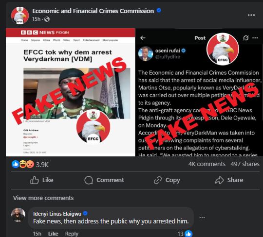 The Economic and Financial Crimes Commission made a post on Monday addressing Verydarkman's arrest.