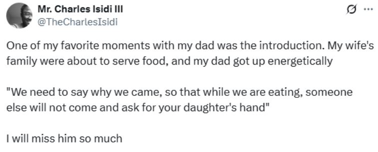 "One of my favorite moments with my dad was the introduction. My wife's family were about to serve food, and my dad got up energetically "We need to say why we came, so that while we are eating, someone else will not come and ask for your daughter's hand" I will miss him so much," he wrote on X on Monday.